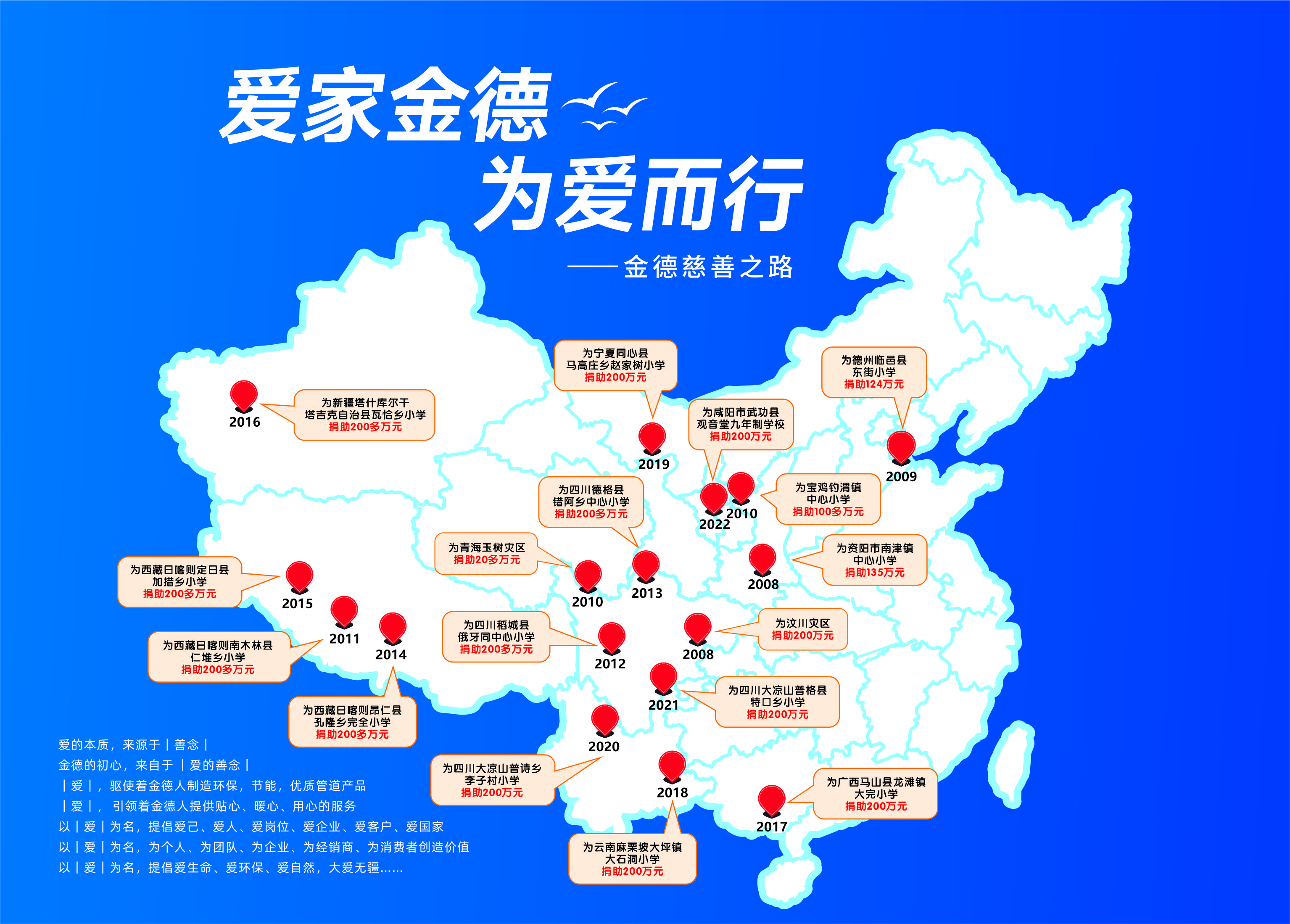 為了銘記汶川地震,也為了幫助更多貧困地區(qū)的孩子們得到更好的教育,金德管業(yè)集團把每年的五月份定為企業(yè)的慈善月。每年五月,金德管業(yè)集團全體員工和廣大經(jīng)銷商朋友都會慷慨解囊,捐助一所希望小學(xué),期間金德人做慈善的腳步從未中斷過。
